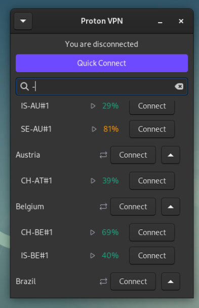 If you prefer, click ⏷ next to the country to select a Secure Core server location from the dropdown list. (Note that not all Secure Core countries support all Secure Core server locations.)