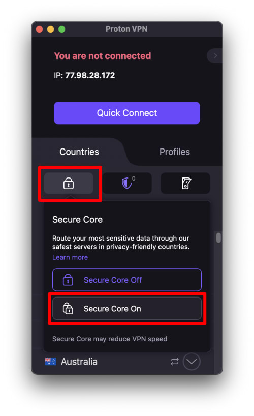 1. Open the Proton VPN app, click on the Secure Core button, and select Secure Core On.