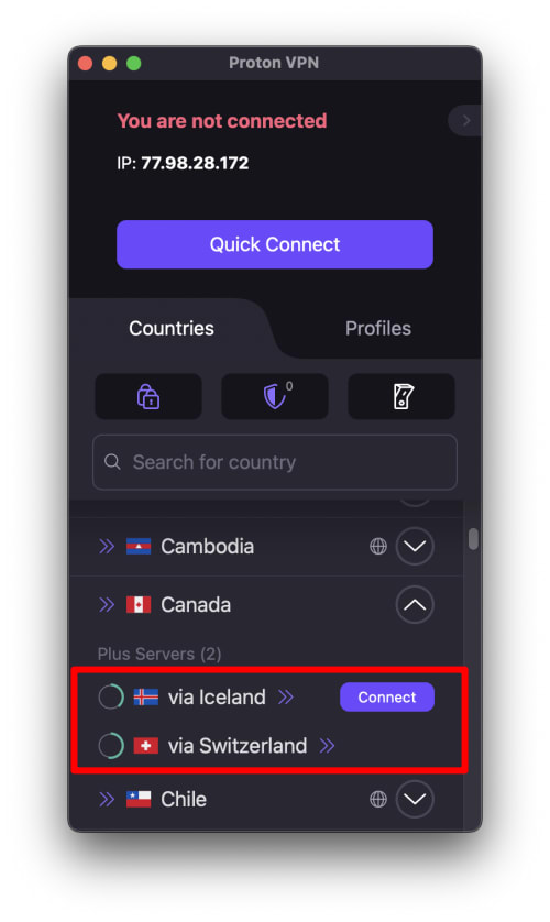 2. Select a country and click Connect to connect to it via one of our Secure Core servers. Alternatively, you can click the ∨ dropdown button next to a country and choose a Secure Core server to route your connection through.